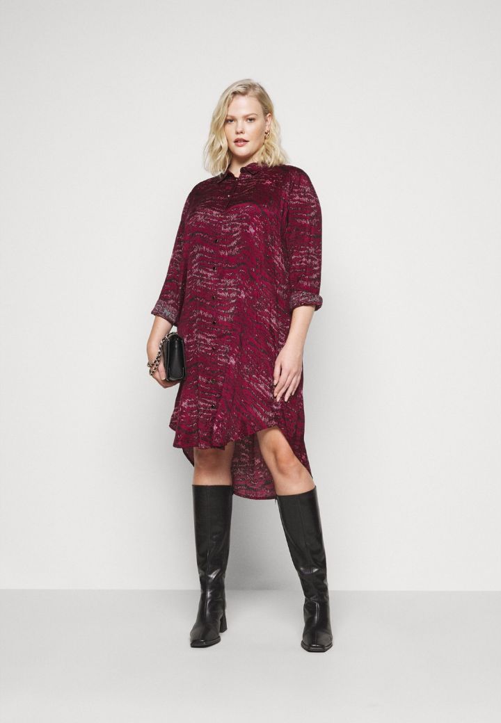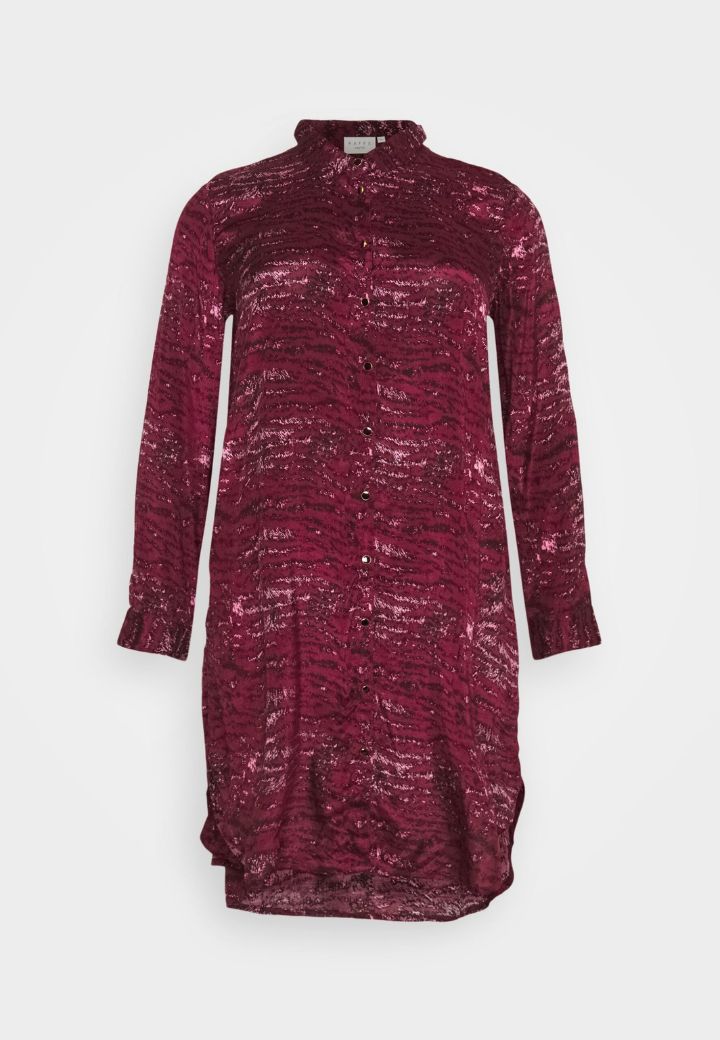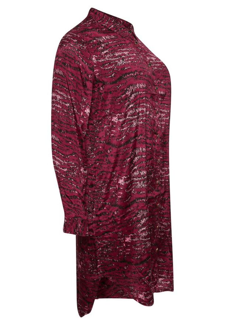 Vestido camisero de corte recto y fluido con estampado animal print y fondo granate. Una pieza muy versátil que llena de fuerza y formalidad cualquier look.