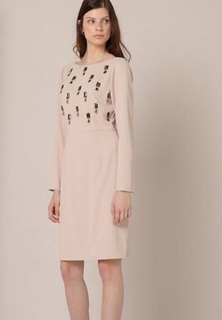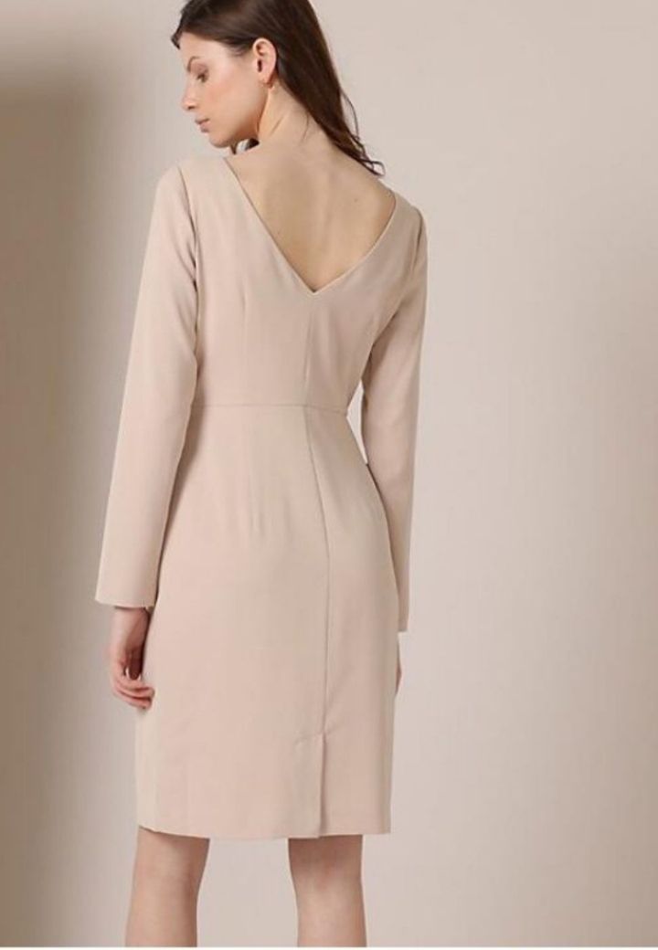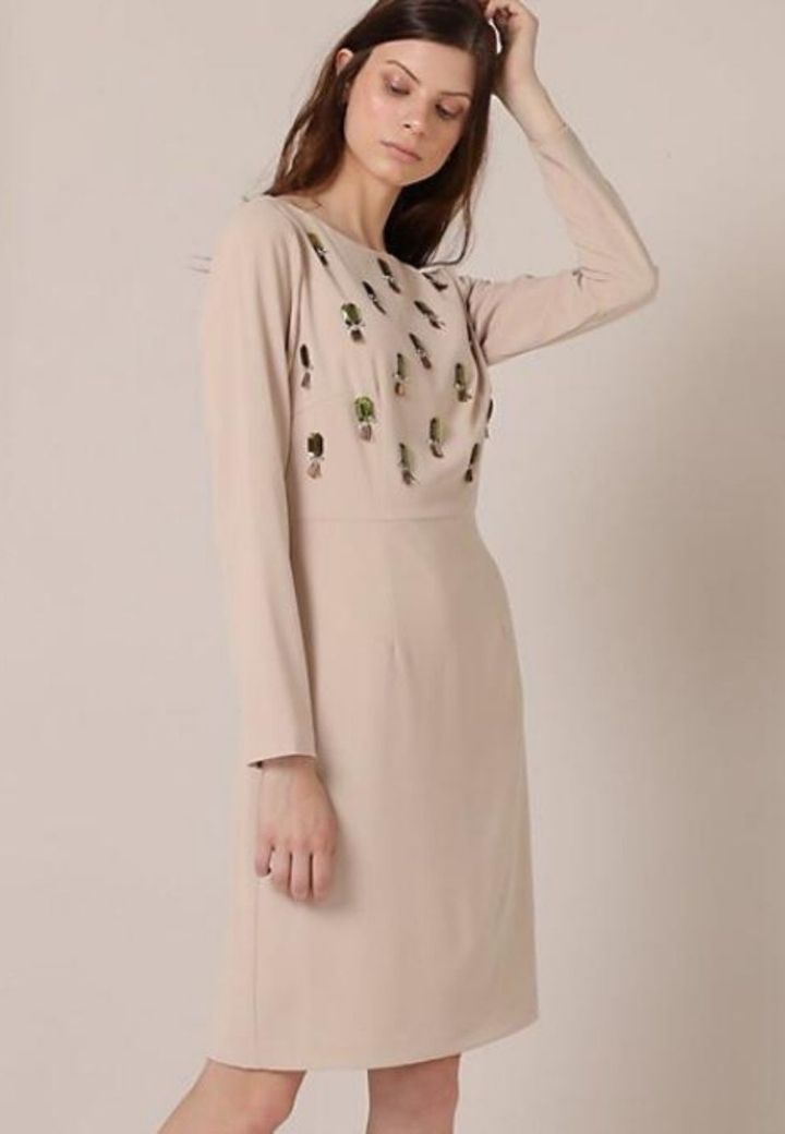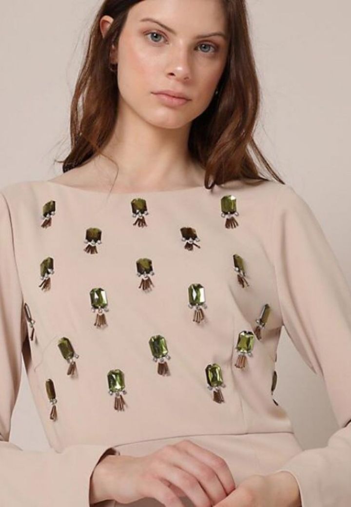 Elegante vestido color beige con cristales bordados en la parte frontal y escote en la espalda. Perfecto para ocasiones especiales.