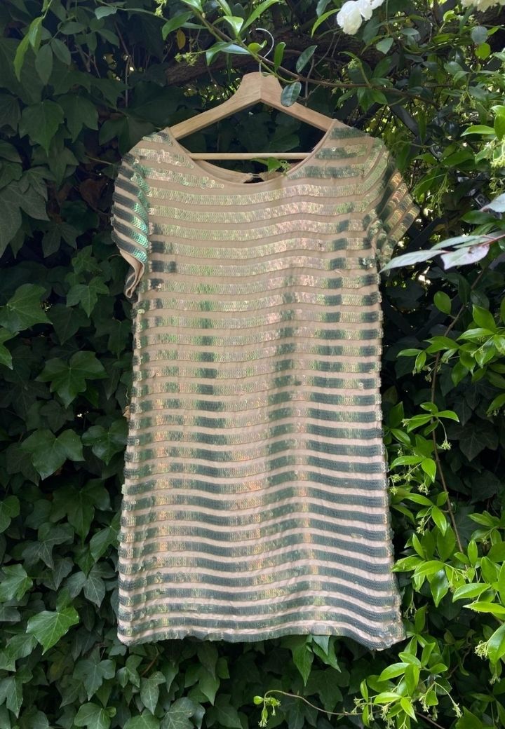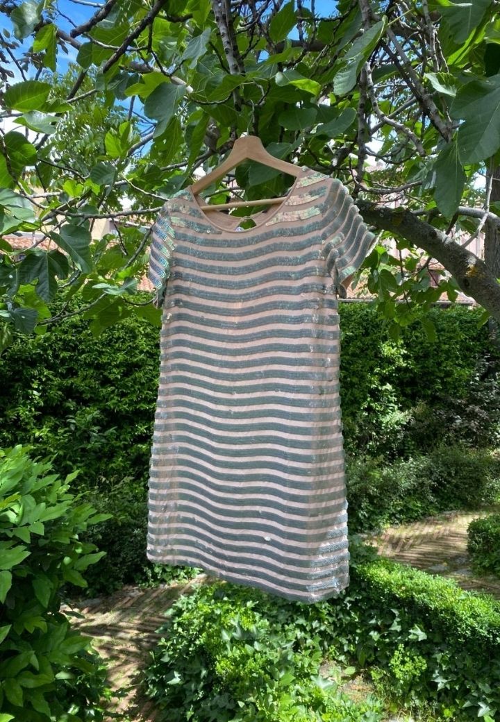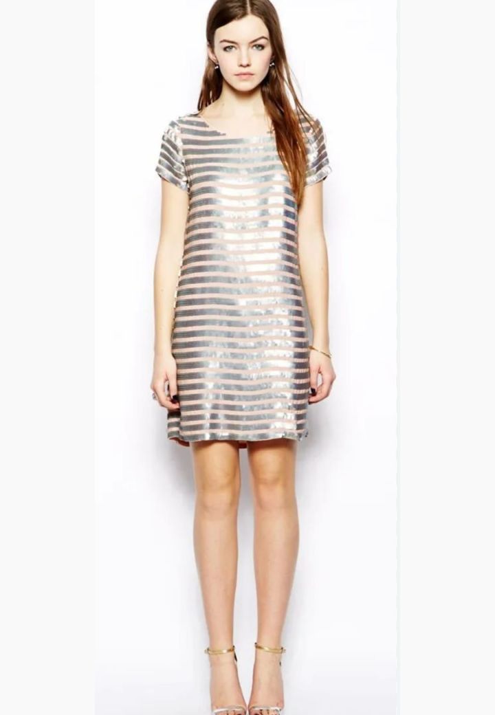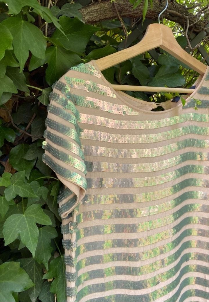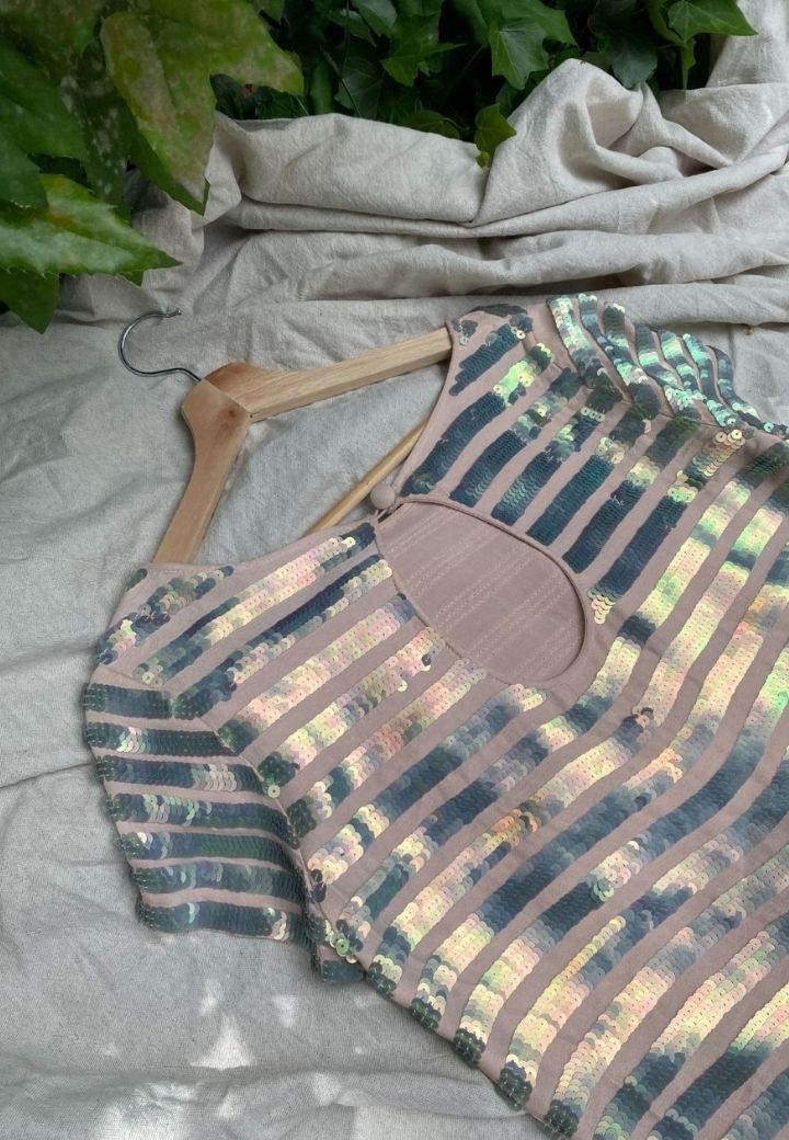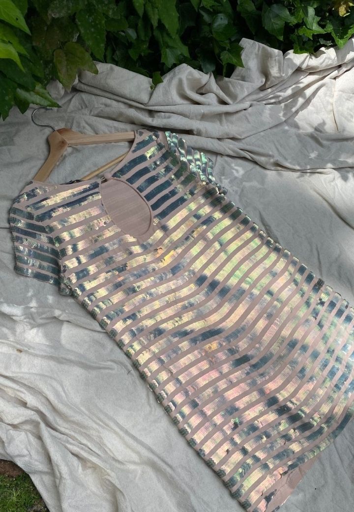 Vestido rosa con detalles de lentejuela plateados, perfeto para ocasiones especiales. Muy elegante y clásico, la pieza perfecta para y atemporal para eventos de primavera.